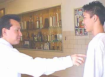 Benny Hernandez points out a dress code violation to Mike Hernandez at Pecos High School