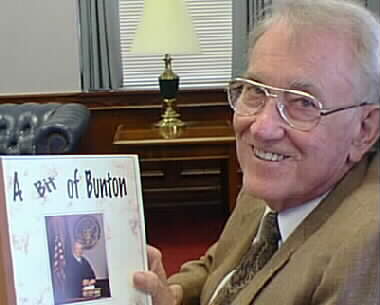 Senior Judge Lucius Bunton holding copy of his memoirs