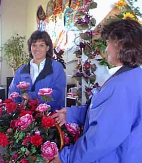 Jackie Burkholder reflected in mirror of flower shop