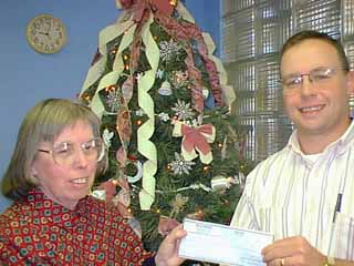 Patsy Bulsterbaum accepts a $100 check from Enterprise publisher Smokey Briggs for her winning feature