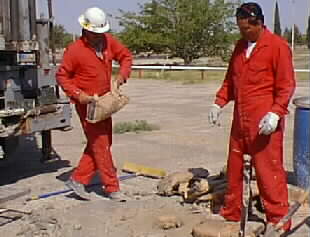 Manny Duenez and Val Morales, fill a monitoring well with sand near an old service station site