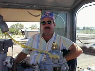 Guy Wayne Weatherman at controls of Pecos Valley Southern Engine #9