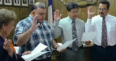 Mayor Dot Stafford, administers the oath to Gerald Tellez Jr., Larry Levario and Johnny Terrazas as Pecos City Councilmen.
