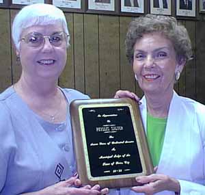 Phyllis Salyer accepts retirement plaque from Mayor Dot Stafford