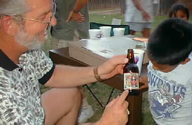 Dick Alligood shows sarasparilla logo to Leonard Gurule