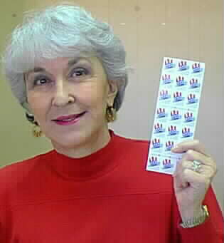Postmaster Ramona Sterling holds the new 33-cent stamp