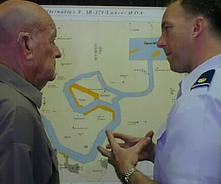 Dale Toone and Lt. Greg Myer discuss low-level bomber training flights.