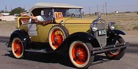 Yellow Rose carries Mayor Dot Stafford in rumble seat. Bill and Pat Hubbs in front